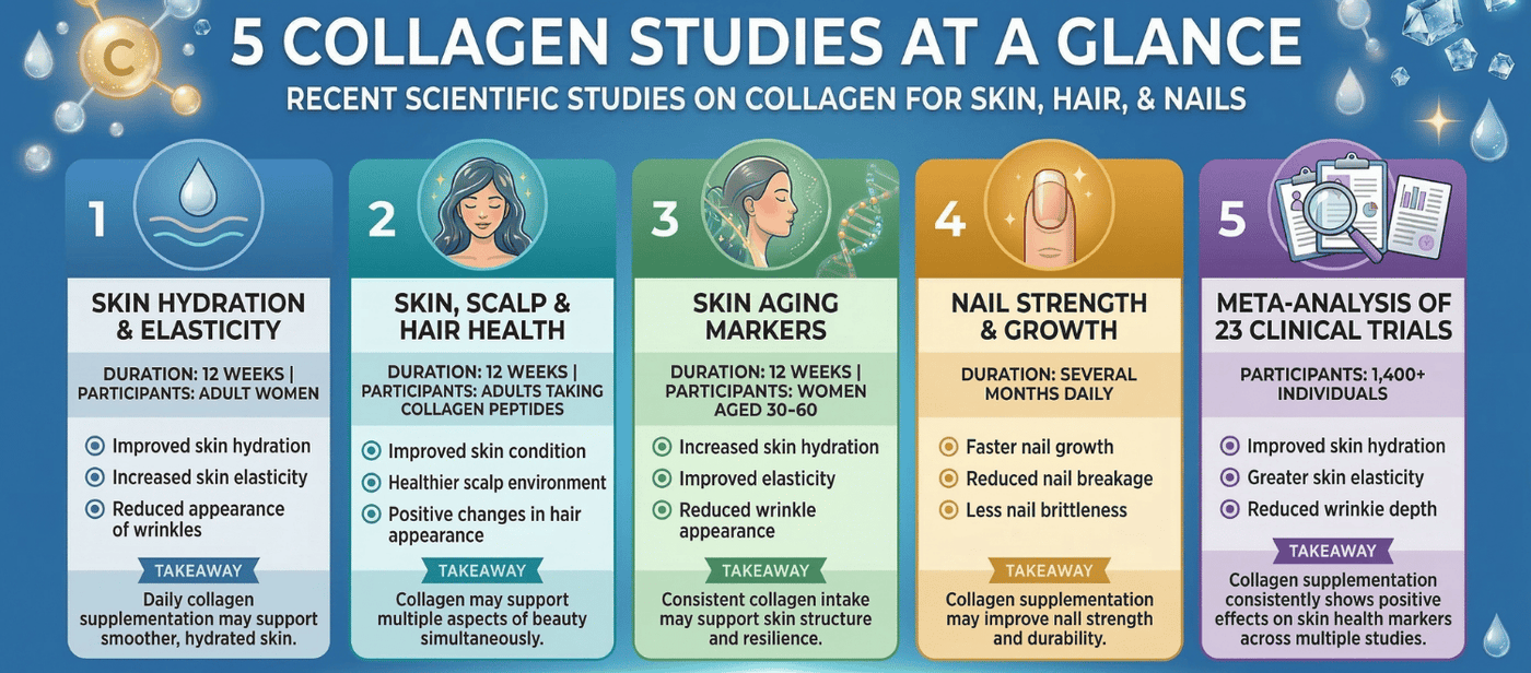 In this article, we’ll look at five recent studies exploring how collagen supplementation may support skin elasticity, hydration, hair strength, and nail health.